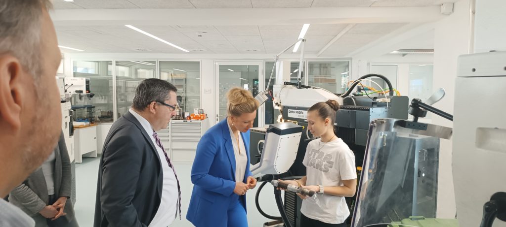 Teilnehmerin Amelie führte die Ministerin souverän durch die einzelnen Arbeitsschritte und erläuterte, was es alles braucht, bis ein Lichtschwert fertig ist. Stolz präsentierte sie dabei ihr eigenes Exemplar. Anschließend sprach Ina Brandes mit allen Teilnehmenden und den Dozenten.
