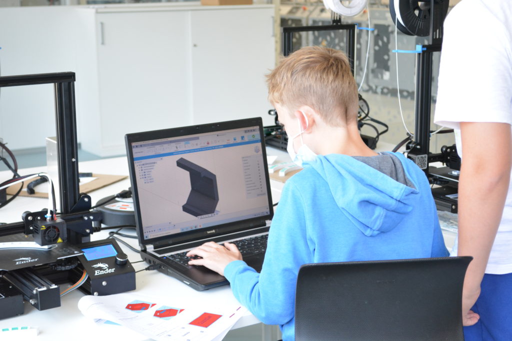 Danach ging es dann ans praktische Arbeiten. Die Schüler:innen bauten ihren eigenen 3D-Drucker auf und justierten diesen für optimale Druckergebnisse. Ein 3D-Drucker ohne Teile, die man drucken kann, nützt aber nicht viel. Daher ging es nach dem Bau des Druckers gleich an die Konstruktion einer Controllerbox für die LED-Uhr, die die Teilnehmenden im Kurs bauen sollten. Die Konstruktion erfolgte mit einem CAD-Programm am Computer. Nach der Konstruktion wurde die Box erst gesliced und damit für den speziellen Druckertyp vorbereitet und anschließend gedruckt, um in die Uhr verbaut zu werden.
