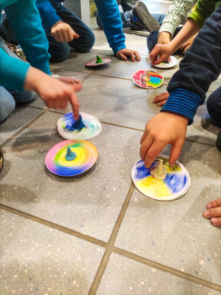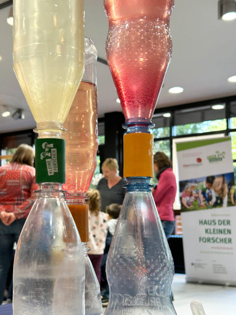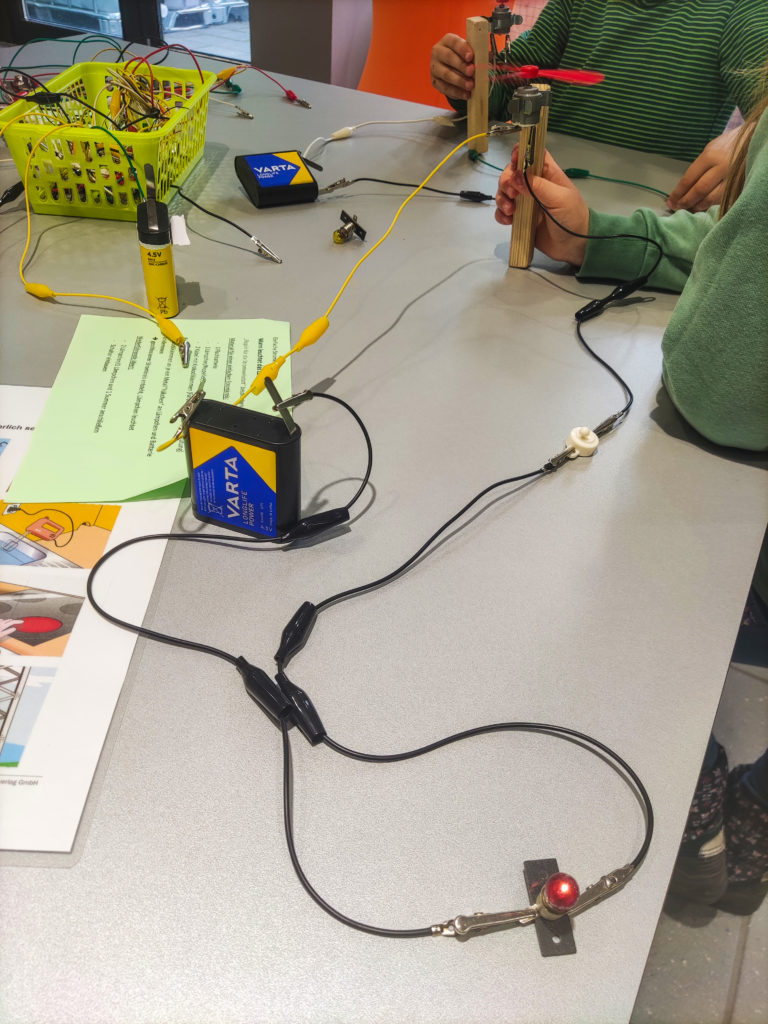 Begeistert wurde auch diesmal wieder zu Kernthemen der Stadtwerke – Wasser, Strom und Energie – entdeckt und geforscht: Was schwimmt und was sinkt im Wasser? Kann Knete eigentlich schwimmen? Wie entsteht ein Tornado in der Wasserflasche? Wie kann ich aus Holzstäben und Knete einen Turm möglichst hoch und möglichst stabil bauen? Wie muss ich Kabel mit Batterie und Lampe verbinden, sodass sie leuchtet – und wie kann ich noch einen Schalter einbauen? Welche optische Täuschung entsteht, wenn ich einem bunt bemalten Kreisel Schwung gebe?