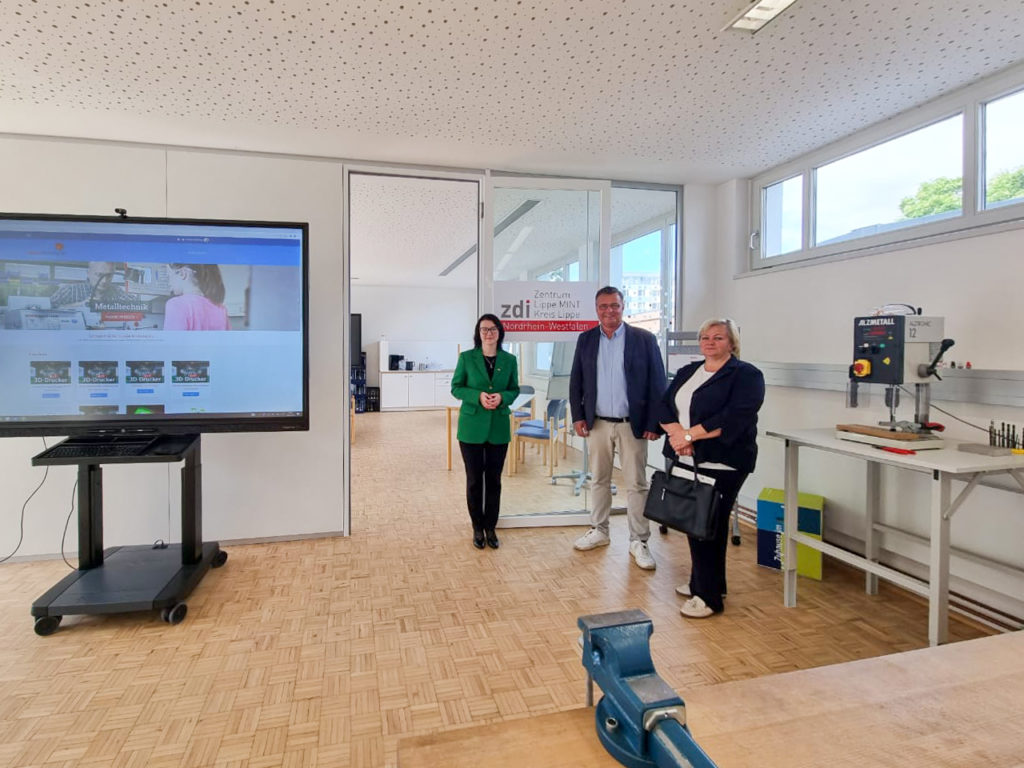 Thomas Mahlmann (Lippe Bildung eG/zdi-Zentrum Lippe.MINT) führte die Besucherinnen und Besucher dann in das zdi-Schülerlabor Erfahrungsraum.MINT und erklärte die vielfältige Nutzung. Selbst Hand anlegen konnte die Gruppe bei der Erstellung eines Schlüsselanhängers aus Kunststoff. Besonders beeindruckt war die Delegation vom 3D-Druckerkurs, den das zdi-Zentrum Lippe.MINT in Präsenzform und in hybrider Form seit 2020 durchführt.