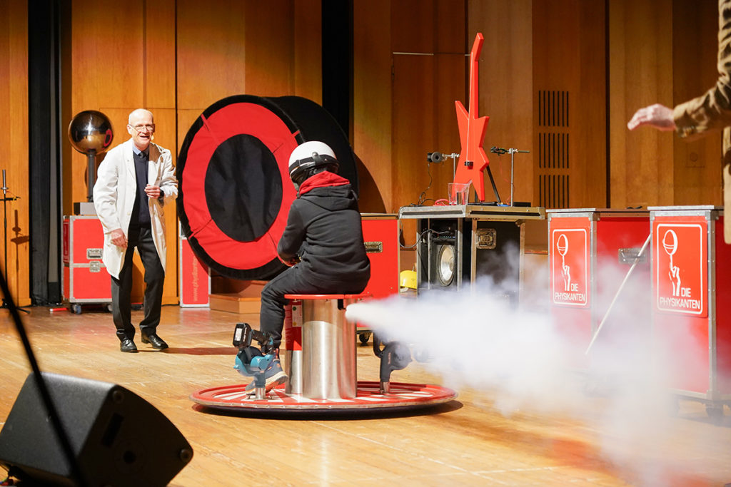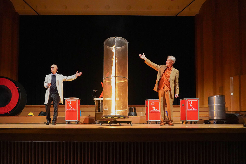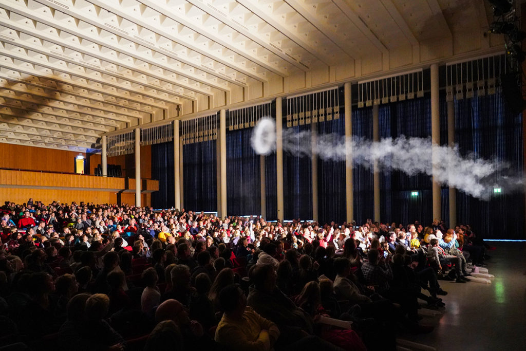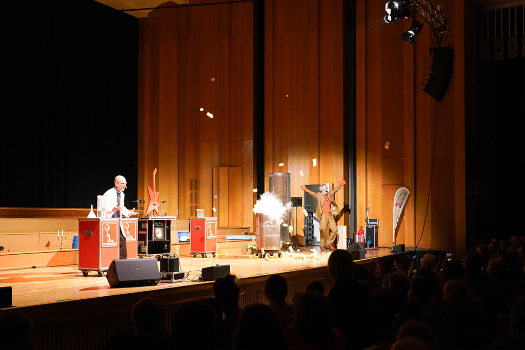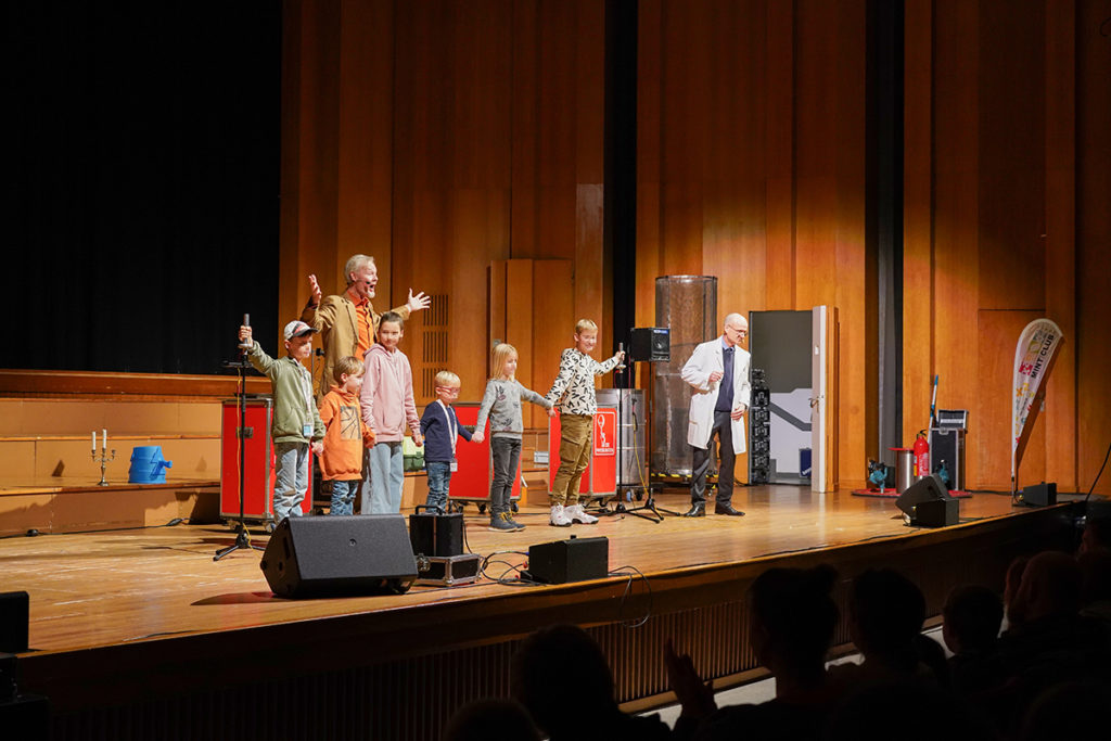 Die Konzerthalle Bad Salzuflen bot die ideale Kulisse für die energiegeladenen Experimente der Physikanten. Von der ersten Minute an war die Begeisterung der kleinen Forschenden spürbar – leuchtende Augen, staunende Gesichter und mitreißende Beifallsbekundungen zeugten von der Faszination, die in der Halle herrschte.