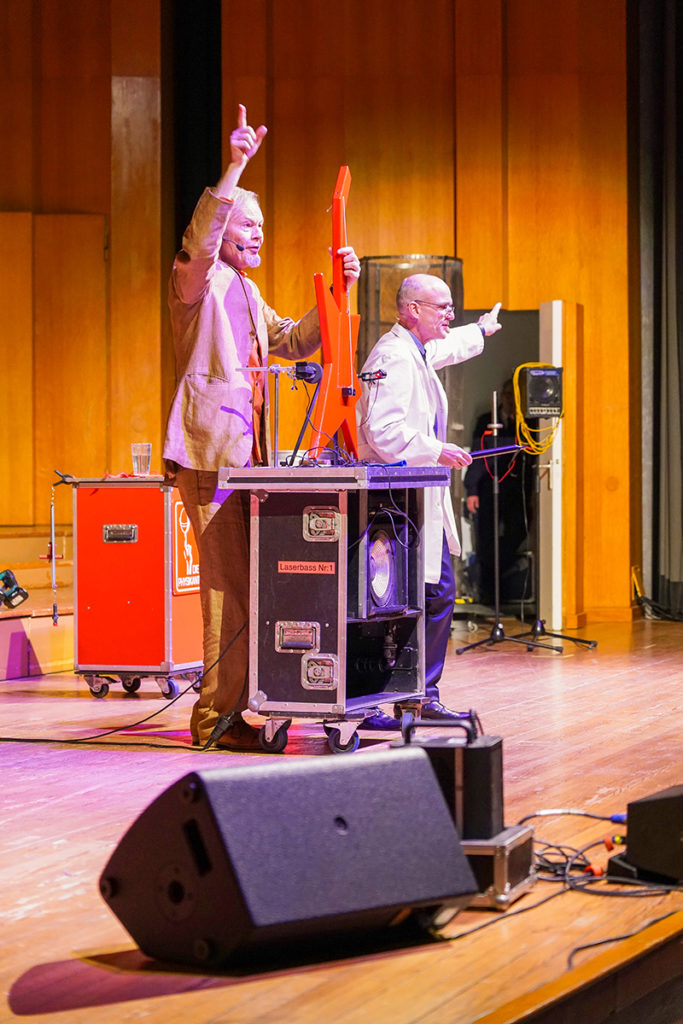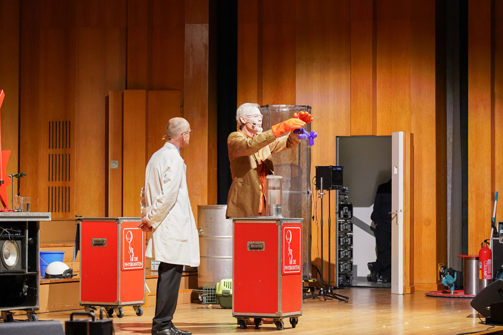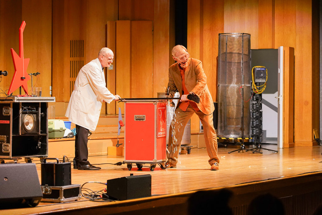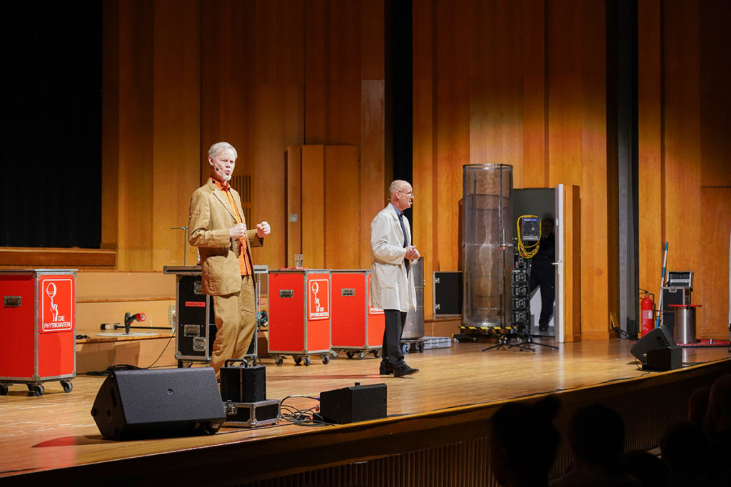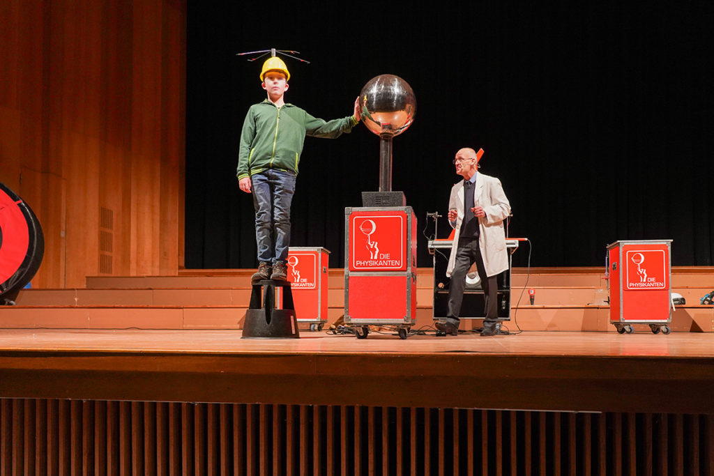 Die Konzerthalle Bad Salzuflen bot die ideale Kulisse für die energiegeladenen Experimente der Physikanten. Von der ersten Minute an war die Begeisterung der kleinen Forschenden spürbar – leuchtende Augen, staunende Gesichter und mitreißende Beifallsbekundungen zeugten von der Faszination, die in der Halle herrschte.
