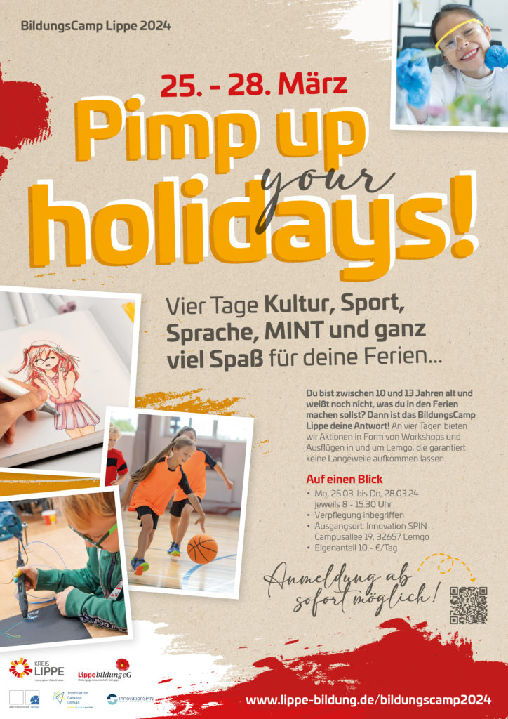 In den Osterferien noch nichts vor? Wie wäre es dann mit vier Tagen Kultur, Sport, Sprache, MINT und ganz viel Spaß? Zusammen mit dem Kreis Lippe und tatkräftiger Unterstützung der Alte Hansestadt Lemgo, dem Innovation Campus Lemgo und vielen weiteren Akteuren bieten wir Kindern und Jugendlichen im Alter von 10 bis 13 Jahren ein spannendes und vielseitiges Programm in der ersten Woche der Osterferien.