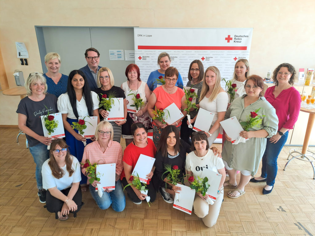 14 Mitarbeiterinnen der DRK-Jugendhilfe und Familienförderung haben von November 2023 bis Juni 2024 die Weiterbildung zur Fachkraft im offenen Ganztag absolviert. In der eigens mit der Lippe Bildung eG entwickelten Weiterbildung erlernen die bisher nicht pädagogisch ausgebildete OGS-Mitarbeiterinnen Handwerkszeug für die alltäglich vielfältigen Aufgaben im offenen Ganztag. In 105 Stunden setzten sie sich unter anderem mit rechtlichen Grundlagen, pädagogischen Alltagssituationen, Gruppenprozessen, Kinderschutz und praktischen Einheiten zu Sprache, Kultur, BNE, MINT oder Bewegungsförderung auseinander.