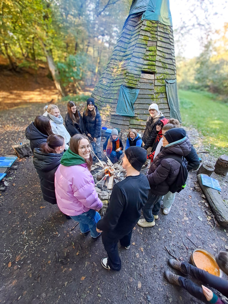 Zunächst standen eine Reflexion der ersten zehn Wochen in den Einsatzstellen und die Themenfindung und Organisation ihres Jahresprojekts auf dem Plan. Tag zwei verbrachten die Freiwilligen an der NABU Umweltbildungsstätte Rolfscher Hof. Dort ging es ums Thema „Überwintern“, das alle auf dunkle und schwierige Zeiten im eigenen Leben übertrugen und so Ideen zum eigenen Überwintern zusammentrugen. In gemeinschaftlicher Arbeit bereiteten die Freiwilligen am Lagerfeuer eine Kürbissuppe und Stockbrot zum Mittagessen zu.