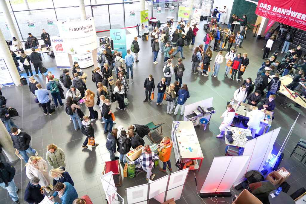 Die Technische Hochschule Ostwestfalen-Lippe bot Stände zum Selbermachen und Hightech zum Ausprobieren an. Das größte Angebot der TH OWL war aber in der Halle nicht zu sehen. In zahlreichen Workshops, Führungen und Informationsveranstaltungen auf dem ganzen Innovation Campus Lemgo wurde den teilnehmenden Schüler:innen gezeigt, wie ein MINT-Studium an der TH OWL aussieht. Weitere Workshops wurden u. a. vom Lüttfeld-Berufskolleg, dem Institut für die Kunststoffwirtschaft, der Universität Paderborn, dem Teutolab Chemie und der Universität Bielefeld durchgeführt.