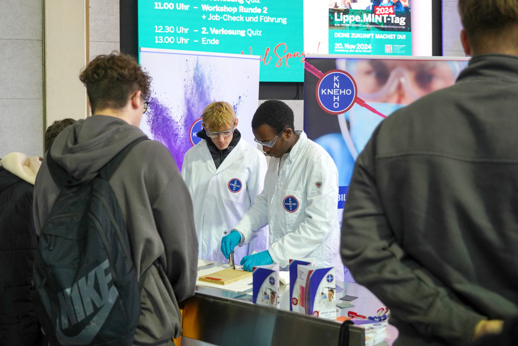Die Technische Hochschule Ostwestfalen-Lippe bot Stände zum Selbermachen und Hightech zum Ausprobieren an. Das größte Angebot der TH OWL war aber in der Halle nicht zu sehen. In zahlreichen Workshops, Führungen und Informationsveranstaltungen auf dem ganzen Innovation Campus Lemgo wurde den teilnehmenden Schüler:innen gezeigt, wie ein MINT-Studium an der TH OWL aussieht. Weitere Workshops wurden u. a. vom Lüttfeld-Berufskolleg, dem Institut für die Kunststoffwirtschaft, der Universität Paderborn, dem Teutolab Chemie und der Universität Bielefeld durchgeführt.